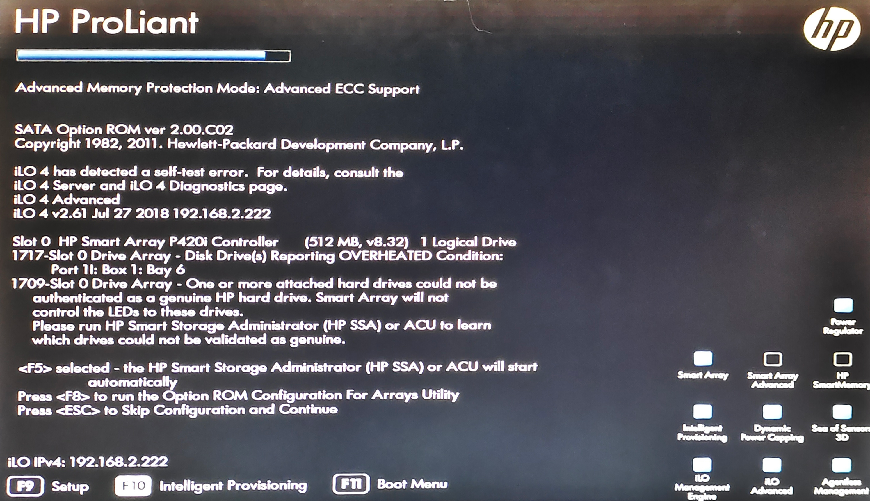 2. 出现按键界面时,先按F10,在出现 “Press <F8>” 提示后按 F8 ,进入raid卡配置管理界面(HP Smart Array P420i)
