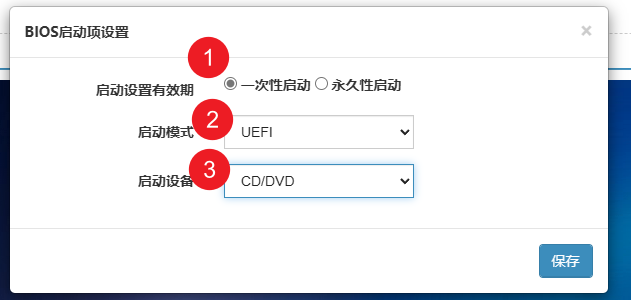 5. 默认一次性启动,启动模式选择“UEFI”,启动设备选择“CD/DVD”,点击保存